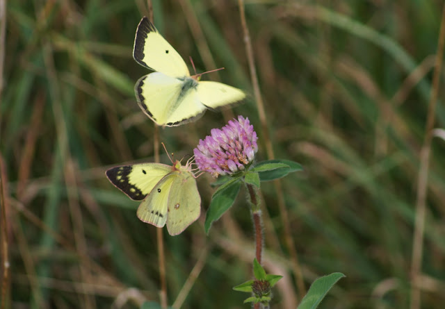 I was back-tracking to try to get closer to this Clouded Sulphur and had just sighted it through my camera viewfinder when all of a sudden a second Clouded Sulphur (male) flew into view! That doesn't happen very often!