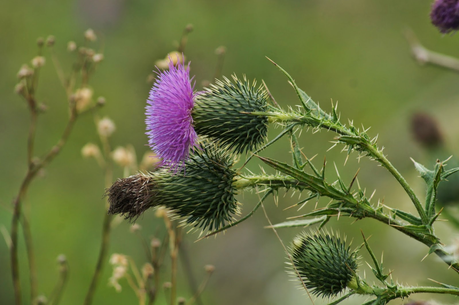 See the snail on the right of the center flower? It's wearing a striped shell.
